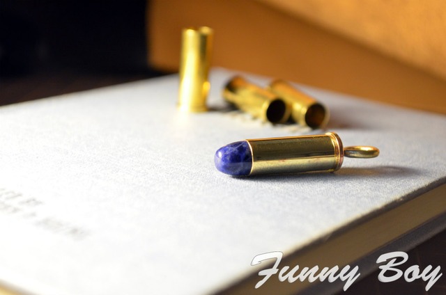 天然石を使用したペンダントヘッドです。 ネックレスやブレスレット、イヤリング、キーホルダー等にお使い頂けます。 弾頭はソーダライトを使用。 弾頭は一つ一つ手作業で削りだし、丁寧に磨いています。 他サイトでも販売しておりますので、購入のタイミングで売り切れてしまった場合は写真の弾とは異なります。(同一の製品を新たにお作りして発送させて頂きます。) 定形外発送のみ送料をサービスさせて頂きます。 エアキャップ等の緩衝材で丁寧に梱包致します。 (過去数百件程、同一郵便局から定形外での発送を利用していますが、不着は一度もありません) 弾頭の種類や薬莢サイズはこれから多少増やしていきますので、興味のある方はたまに覗いてみて下さい。 弾頭の天然石で取り扱って欲しい石がありましたら検討させて頂きますので、気軽にご連絡下さい。 薬莢は本物の薬莢の再利用品ですが、穴を開け、加工してありますので実弾としては再利用できません。 射撃練習場からの払い下げ品を使っています。 因縁がある物では御座いませんので安心してください。 天然石を使用していますので、衝撃など与えると弾頭が破損する場合があります。 薬莢が破損、変形しない限り、弾頭が破損しても再装填は可能ですが、有料となります。金額や日数は事前にご相談下さい。 一つ一つ手作業で製作していますので、傷や細かい部分が気になる方はご購入をしないで下さい。 真鍮や銀、銅、亜鉛を含む金属が使用されています。アレルギーの方はご注意下さい。 その他、気になる事がありましたら、事前にご相談下さい。