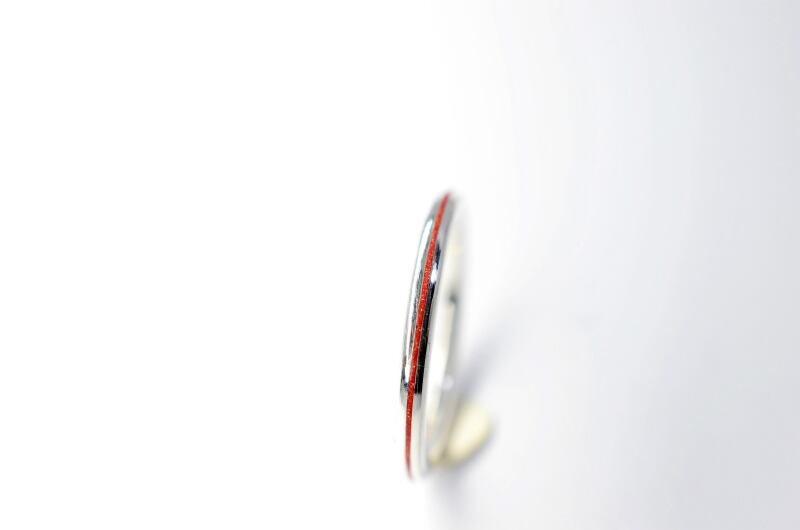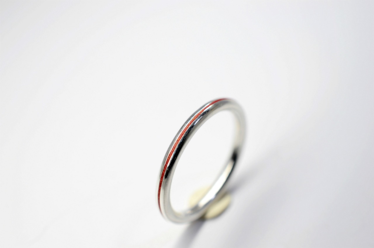 シンプルなデザインのシルバーリングにラインを彫り、樹脂をインレー(埋め込み加工)しました。