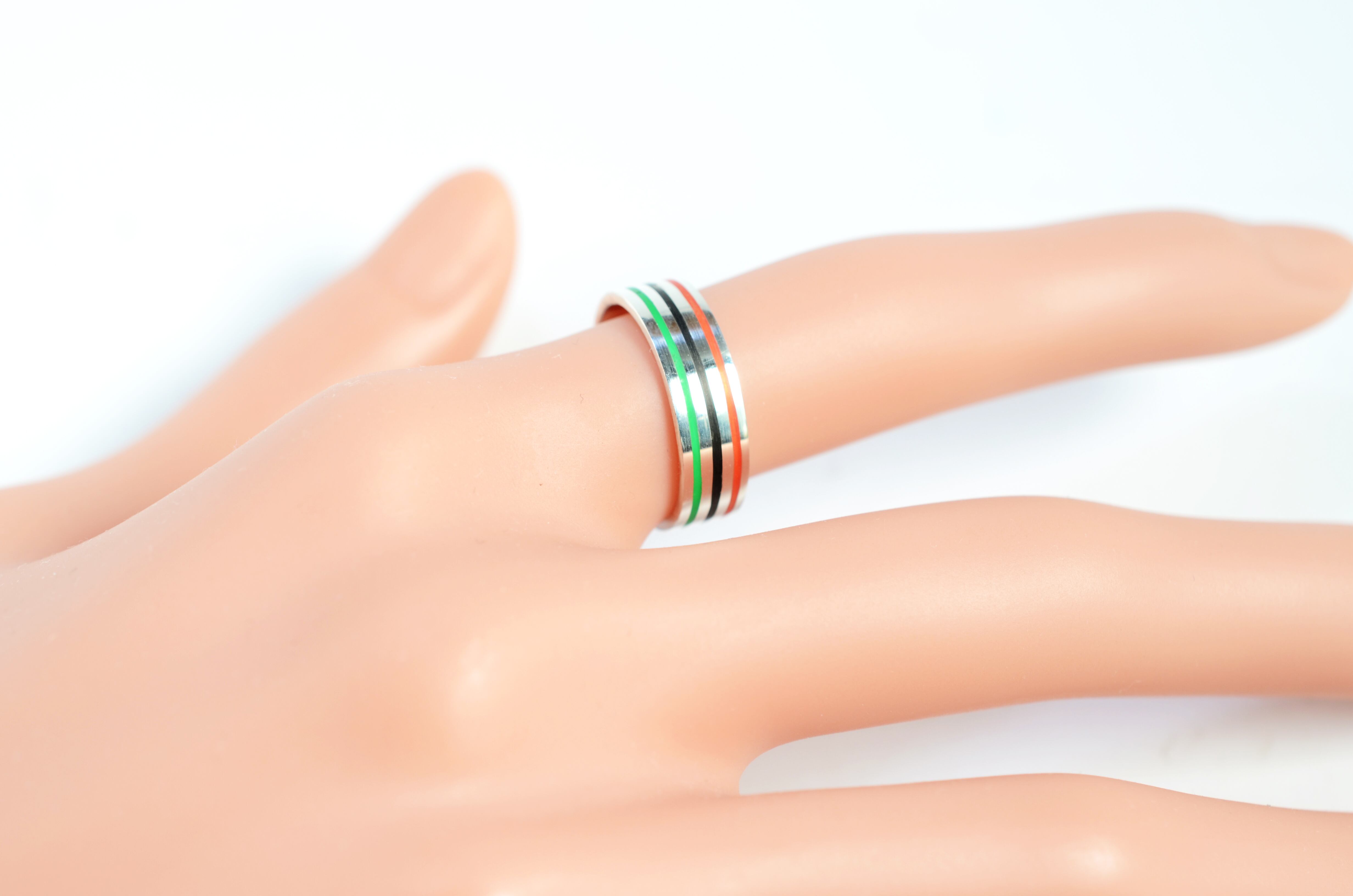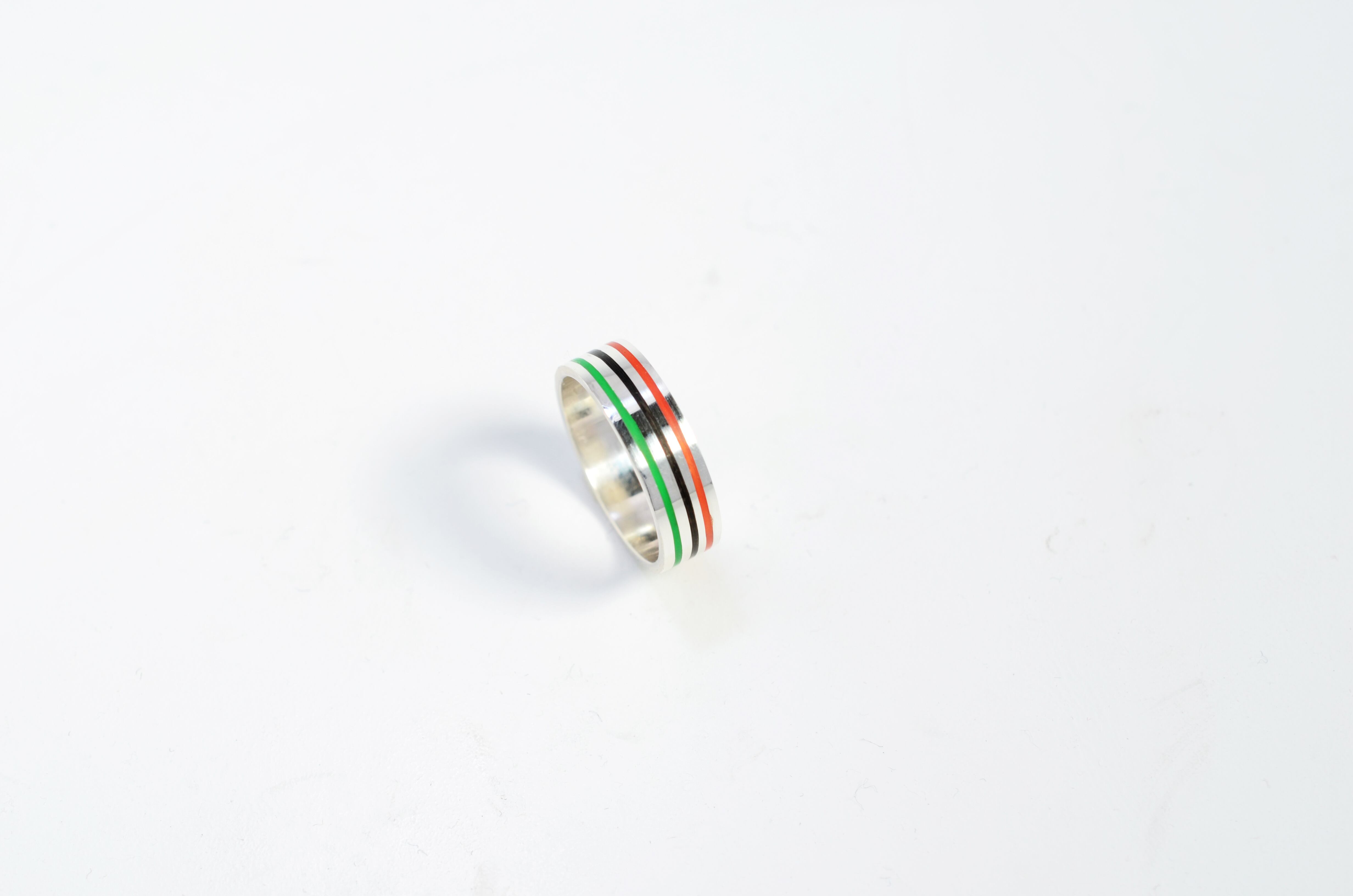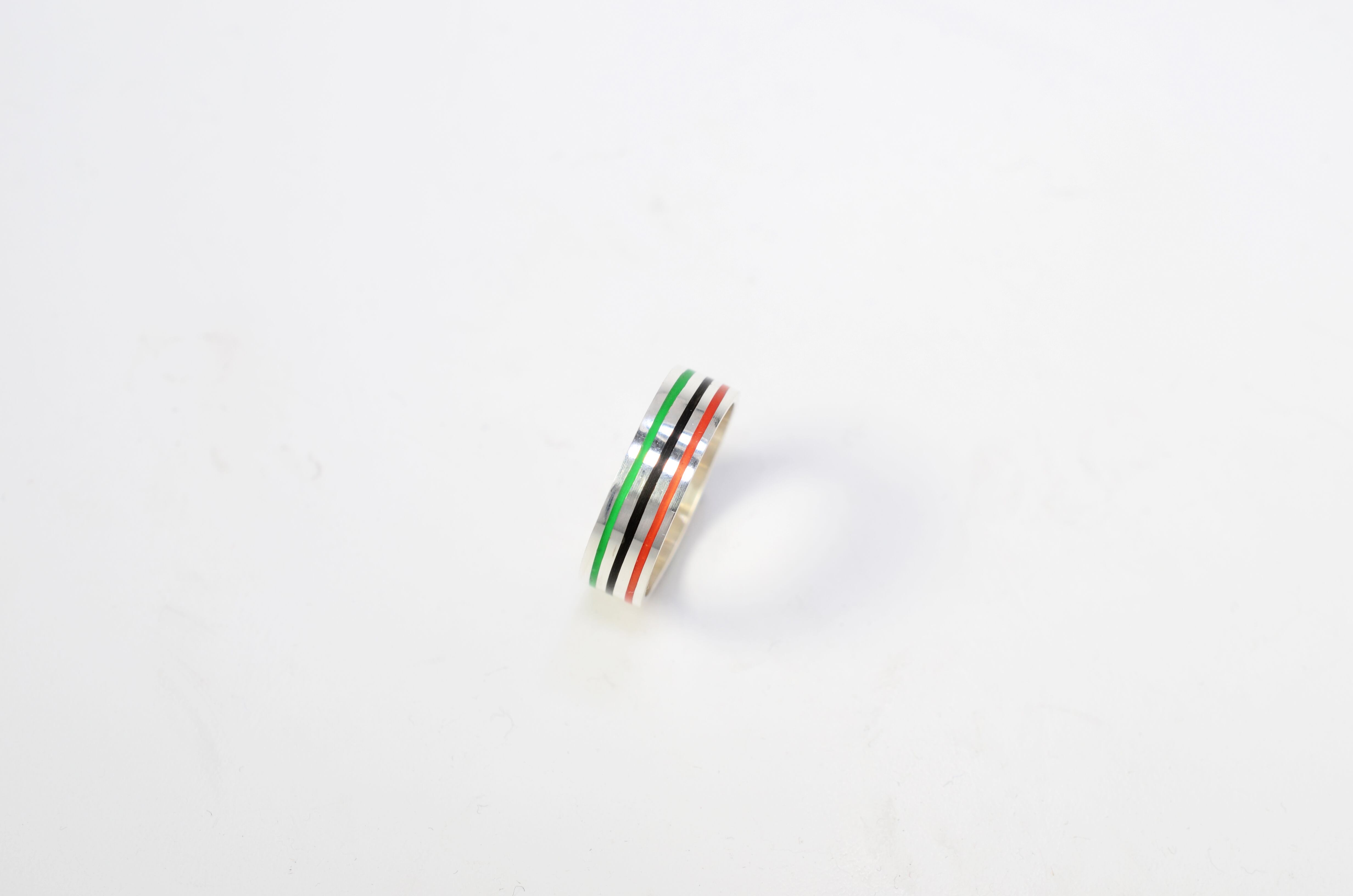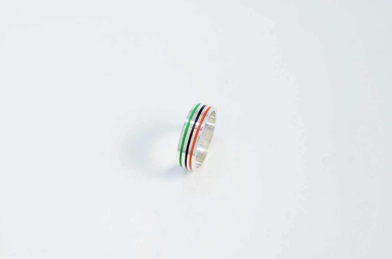 シンプルなプレート状のリングにラインを彫り、樹脂をインレイしてあります。